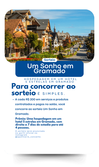 A cada R$ 200 em serviços e produtos contratados e pagos no salão, você concorre ao sorteio Um Sonho em Gramado.
